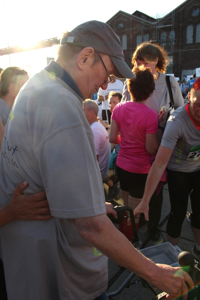 Geschwind packen wir alles zusammen und treten nun selbst einen Wettlauf an zum Ziel. Ilka und Jessica schieben uns im Rollstuhl zum Ziel-Einlauf, damit wir dort unser Laufteam nochmals anfeuern und motivieren können.