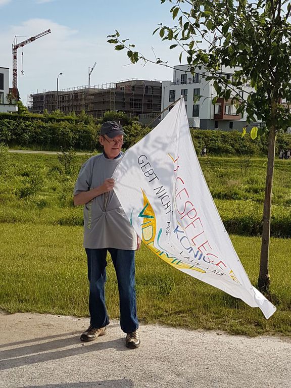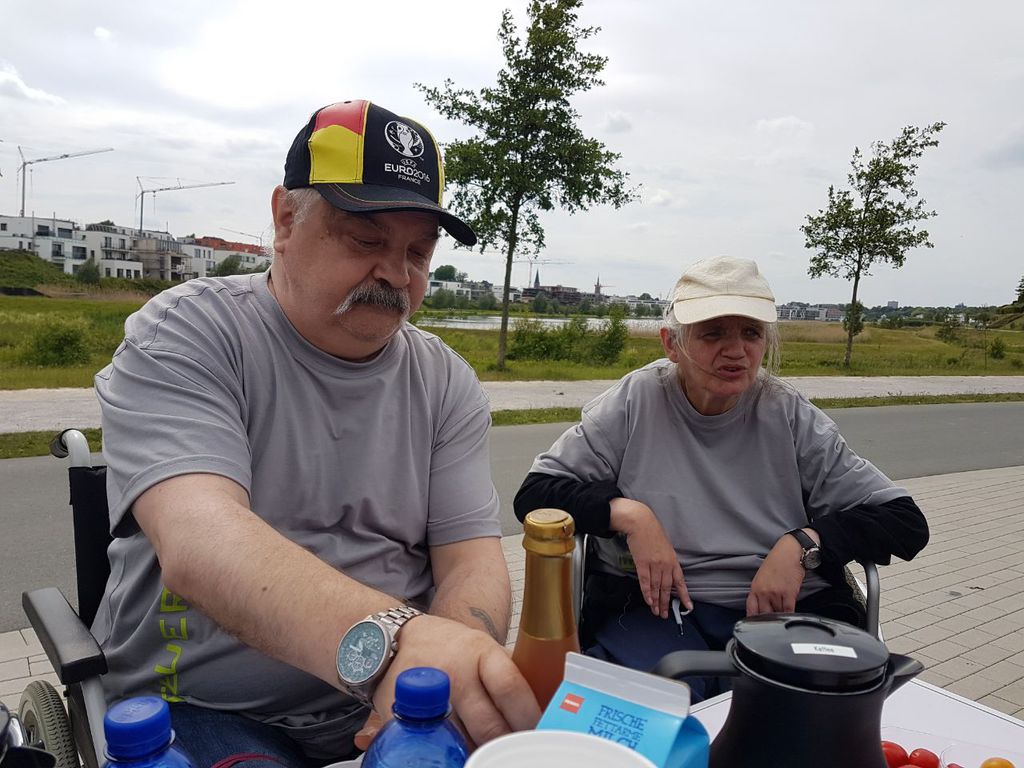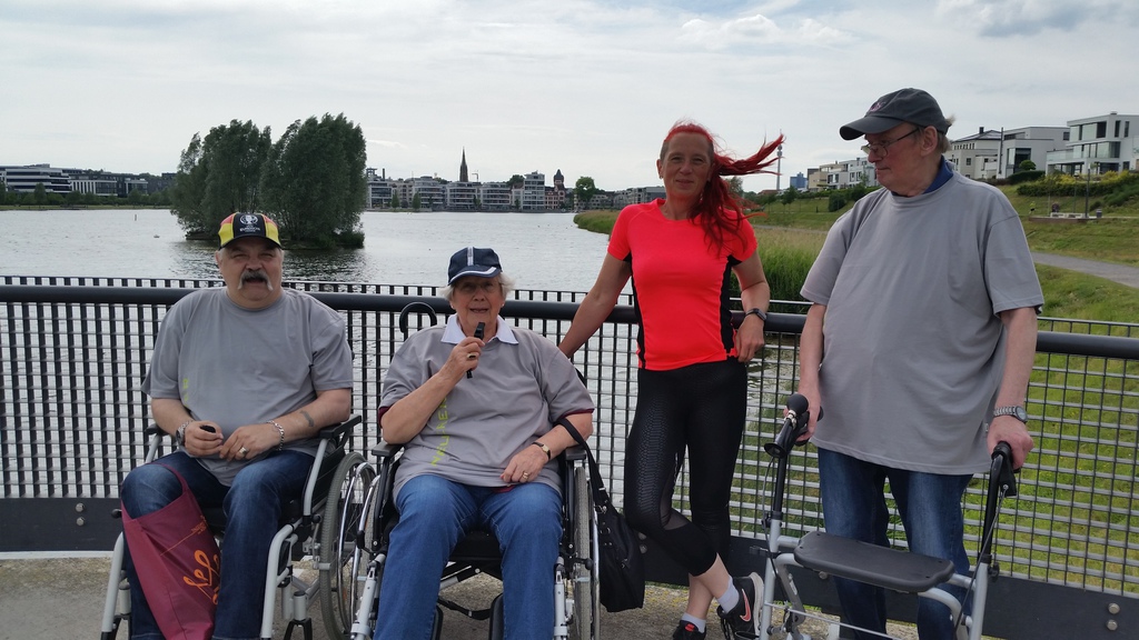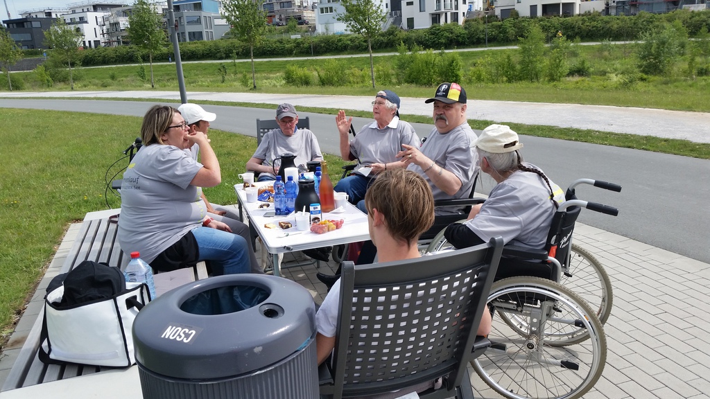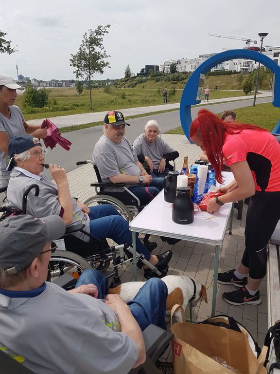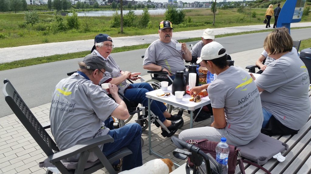 Der Fan-Club inklusive Begleitungs- und Betreuungspersonal der Tagespflege Am Königshalt rückt aus zum Phoenixsee. Getreu dem Motto „Der frühe Vogel fängt den Wurm“ positionieren wir uns frühzeitig an einer strategisch günstigen Stelle direkt am See, damit wir optimale Sicht auf die Vorbeilaufenden haben und bestmöglich anfeuern können.